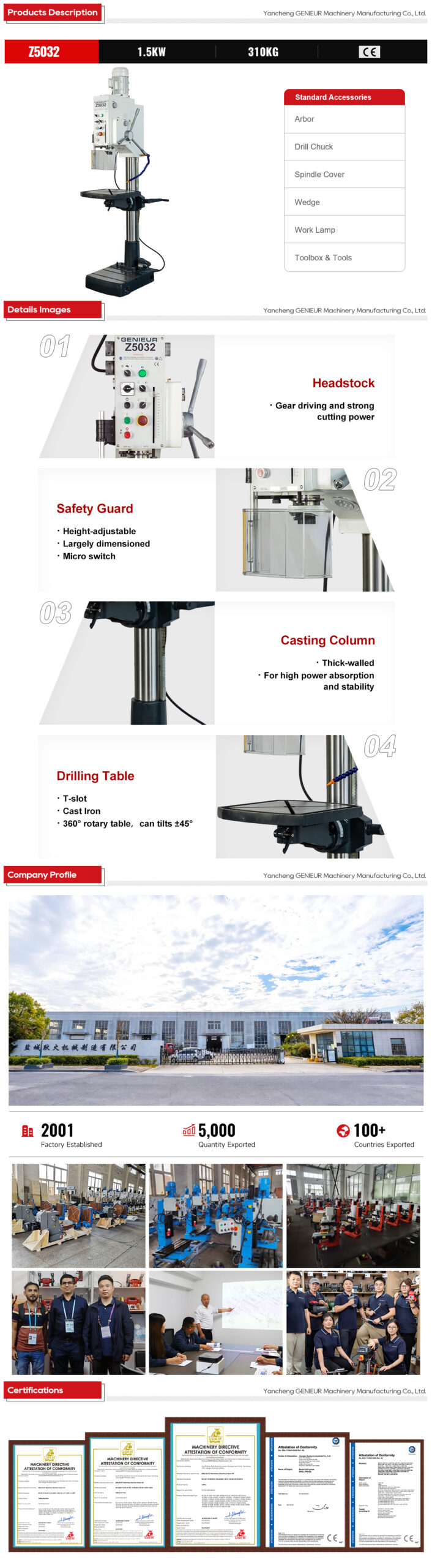 12-Step speed 160mm spindle travel 720mm max. distance from spindle nose to worktable drilling machine for metal drilling tasks features low noise, and overload protection. It supports drilling and reaming, enhancing versatility. With easy operation and durable construction, 12-Step speed 160mm spindle travel 720mm max. distance from spindle nose to worktable drilling machine for metal drilling tasks balances performance and affordability, making it a valuable investment for workshops seeking efficient metal drilling solutions. It meets CE standards, ensuring safety and reliability for long-term use.