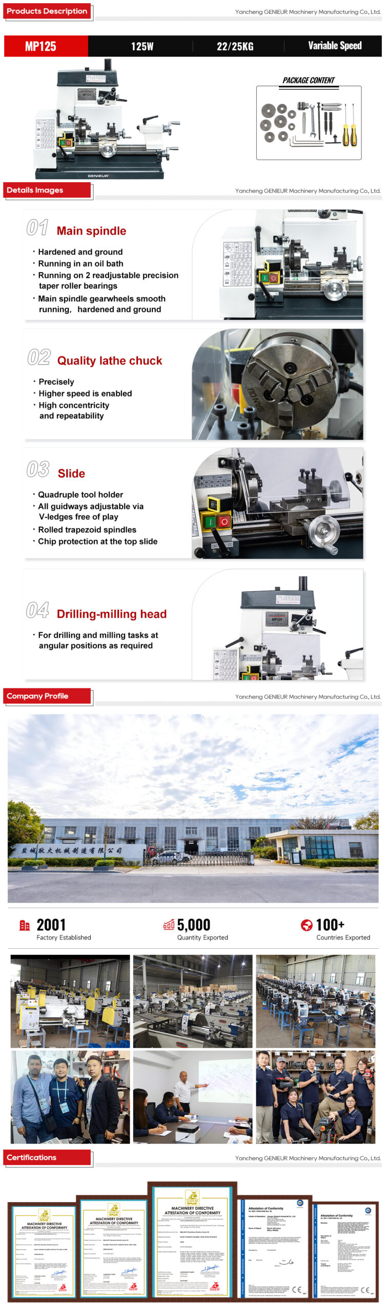 MP125 integrates multiple machining functions, helping students build comprehensive skills without switching equipment. 125mm swing over bed 180mm workpiece length MT1 spindle taper combination lathe milling machine for educational use is a cost-effective, reliable educational tool that bridges theory and practice, shaping the next generation of machining professionals.