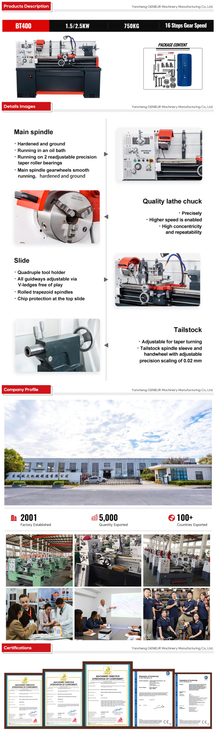 16-Step gear speed lathe machine for hardware producing, embodied by the BT400 model, is very suitable for high-efficiency hardware manufacturing. Its core 16-step gear speed system delivers speed regulation from 45 to 1900RPM, effortlessly handling diverse hardware processing tasks—from precision turning of small fasteners to heavy-duty cutting of thick-walled hardware components.