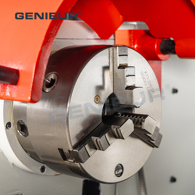 410mm 52mm spindle bore manual lathe machine with saddle for disc parts processing comes standard with both 200mm 3-jaw and 250mm 4-jaw chucks, providing flexible clamping solutions for both symmetrical and irregular workpieces, while a removable chip tray and full-chip protection wall maintain a clean working environment and operator safety.