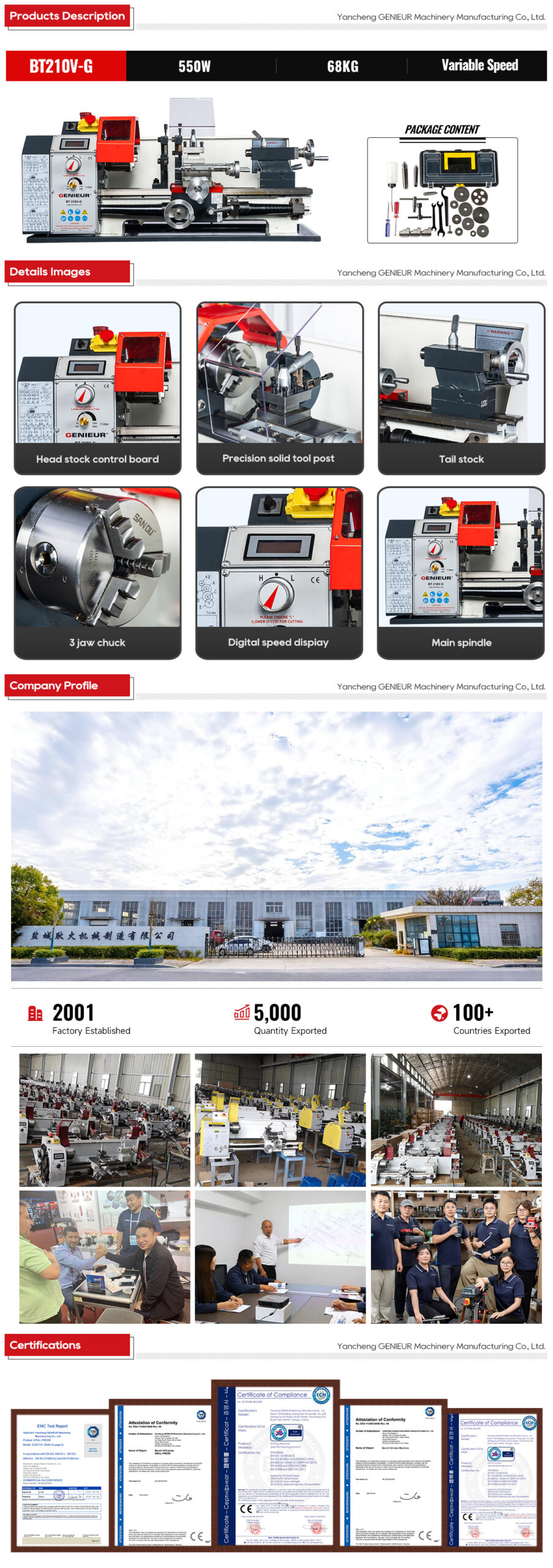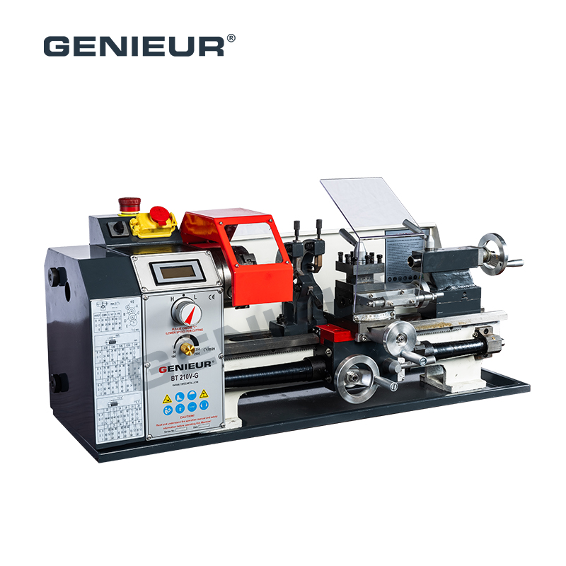 BT210V-G automatic cutting mini bench manual lathe is a machining tool designed for both home and small-scale industrial applications. Equipped with a 550W DC motor, BT210V-G automatic cutting mini bench manual lathe offers a stepless speed range of 50-2500 rpm, ensuring optimal performance for machining tasks such as turning, threading, drilling and grooving.