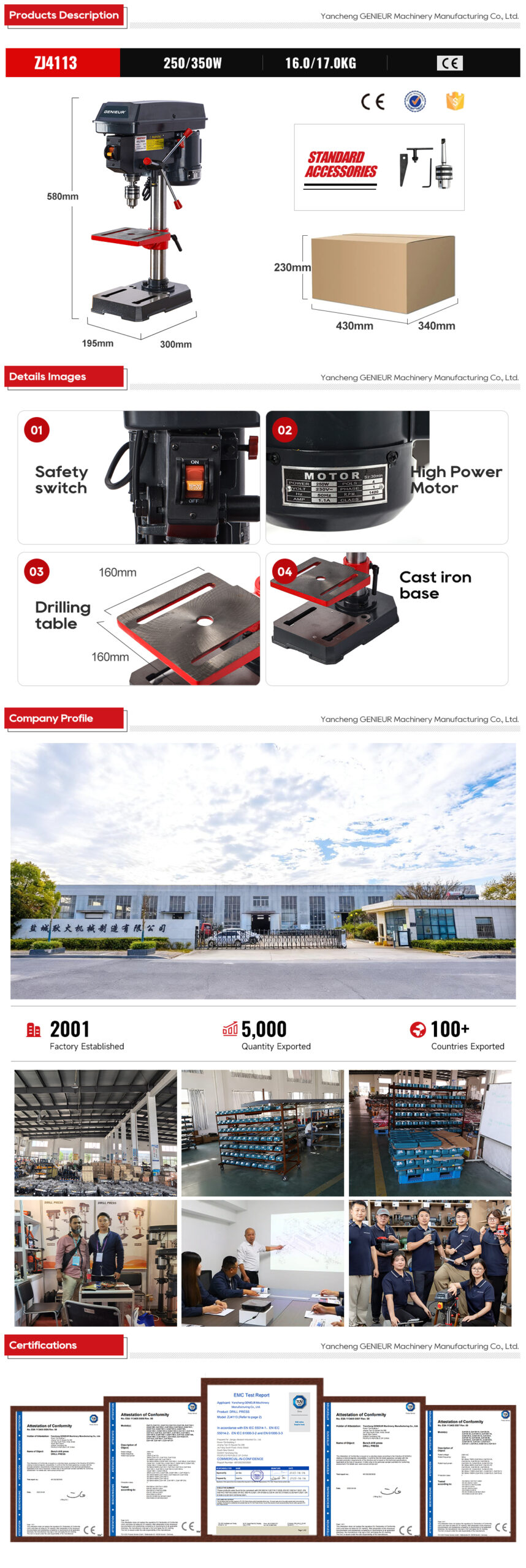 Equipped with a 1.5–13mm chuck capacity, the ZJ4113 supports a wide range of drill bits for diverse home applications. As a 13mm max. drilling diameter 1.5-13mm chuck capacity 16kg portable drill press for home use, it strikes the perfect balance between weight and stability, making it easy to move and store without sacrificing durability.