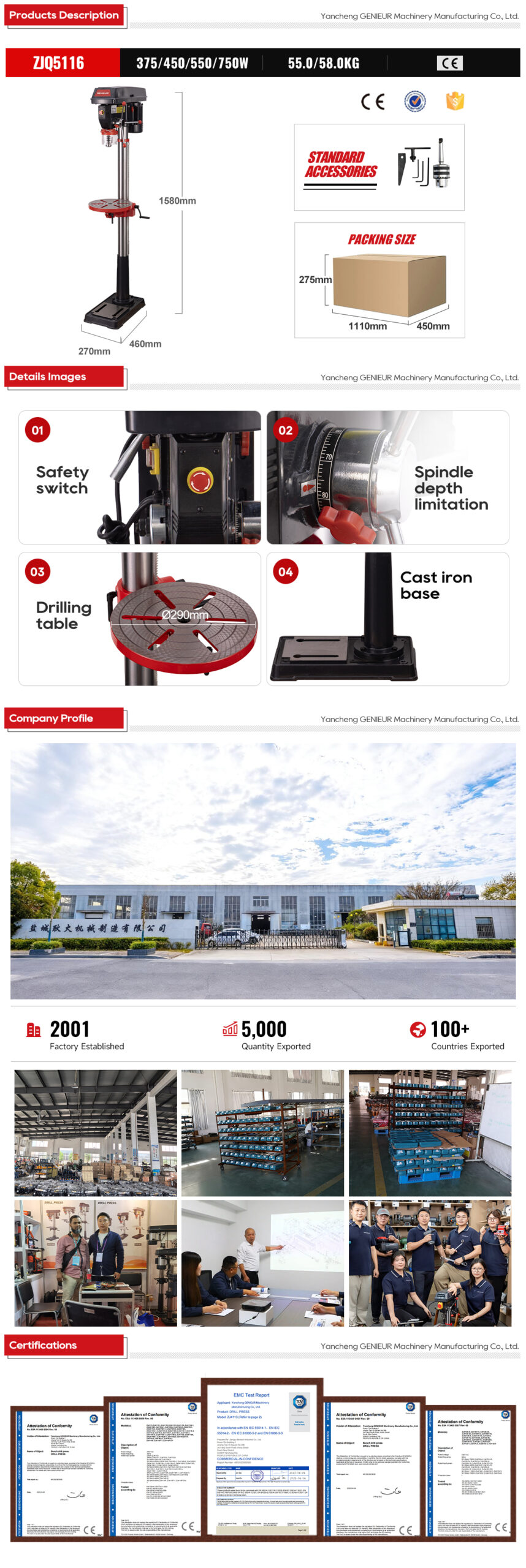 The 1580mm height 16mm max. drilling diameter 725mm max. distance from spindle end to table surface drill press for parts manufacturing, model ZJQ5116, is a professional-grade equipment designed exclusively for parts manufacturing, addressing the core needs of precise drilling for small to medium-sized components. This 1580mm height 16mm max. drilling diameter 725mm max. distance from spindle end to table surface drill press for parts manufacturing features a 1580mm overall height, providing ample operation space for operators and facilitating easy loading/unloading of workpieces, a key advantage for continuous parts production.