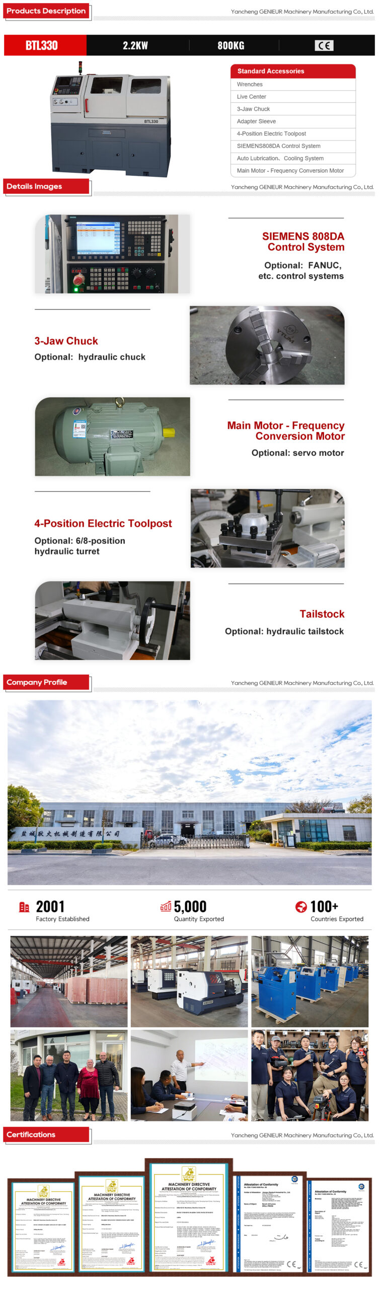 What distinguishes the 330mm max. turning diameter 56mm spindle bore 150-2500RPM spindle speed CNC lathe for auto parts machining is its superior stability and automation, which minimize manual intervention and labor costs while ensuring consistent batch quality—critical for auto industry mass production. Equipped with advanced CNC control, it enables precise programming and smooth operation, even for complex machining tasks. Choose this BTL330 lathe to boost your production efficiency, cut costs and gain a competitive edge in auto parts manufacturing.