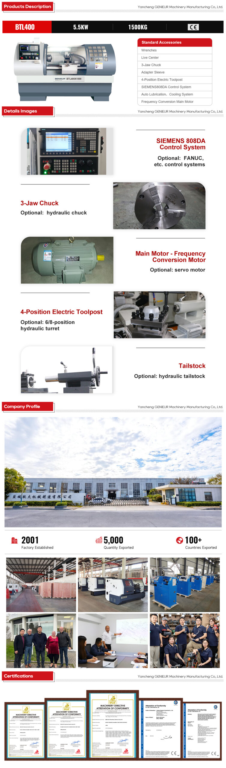 As a professional 8inch/10inch spindle chuck 240mm swing over cross slide 400mm max. turning diameter CNC lathe for precision hardware turning, the BTL400 features a 240mm swing over cross slide and 400mm maximum turning diameter, enabling flexible processing of small to medium-sized precision hardware parts, such as bolts, shafts, and fittings, without frequent machine adjustment.